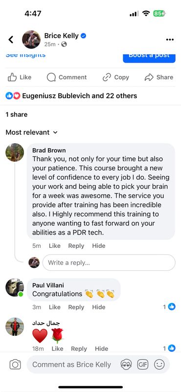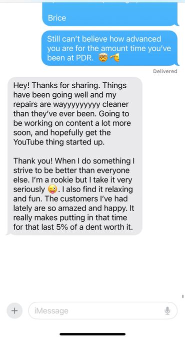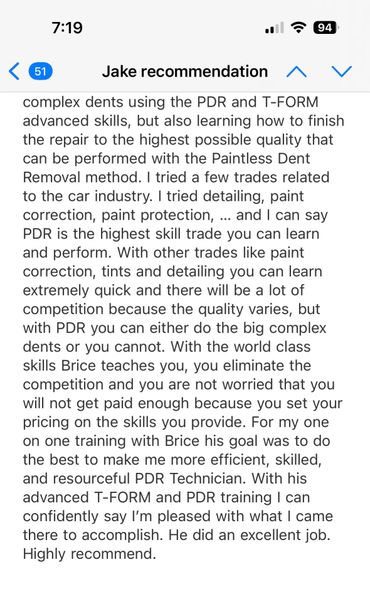 If you're a PDR technician like me, you can remember that learning paintless dent repair was no easy task. I often wished I had a mentor there by my side to help me through the rough times of trying to figure out how to deliver high-quality results. Well, it's time to give back! I want to share with you what I've learned after many years of constantly pushing myself out of my own comfort zone to be the best I could possibly be at this amazing craft. Initially, I set out to offer a subscription video tutorial site where you can watch me perform these repairs, but then I had a shift in the vision of what I really wanted my students to take away. There’s nothing better than actual one-on-one tailored training with a mentor by your side in an environment where you can gain true value by being there in-person asking the real questions. So here is my vision for you. You'll not only learn what it takes to deliver the highest quality retail repairs in your market, you'll learn what it takes to acquire a loyal customer following that will be with you for years to come.